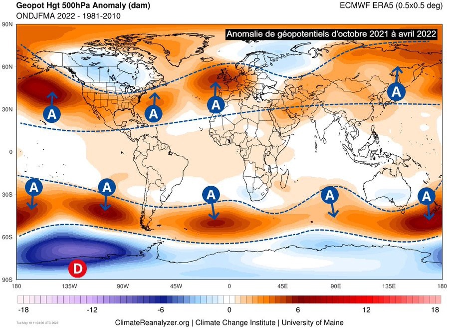 On peut voir grâce à l’autre carte associée , la remontée réelle de la ceinture anticyclonique , en latitude dans l’hémisphère nord (englobant trop souvent la France).