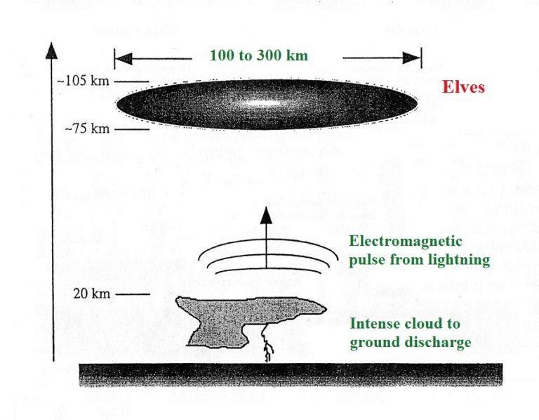 Les elfes (ELVE, en anglais), ou halos, prennent la forme de disques faiblement lumineux ou d’anneaux, et apparaissent lors d’éclairs puissants, à la base de l’ionosphère (à des altitudes de l’ordre de la centaine de kilomètres). Ces lueurs sont en expansion.