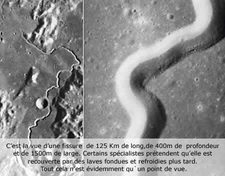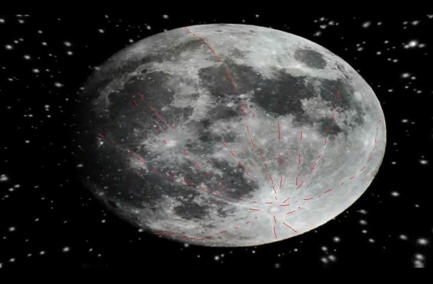 Des fissures sont visibles sur la surface lunaire , elles vont d’un pôle à l’autre…..elles sont soulignées en rouge..