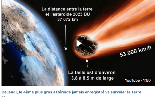Ce jeudi 26 janvier 2023, l’astéroïde « BU 2023 » va passer très près de notre planète , la frôler à une distance de seulement 3 500 kilomètres , selon les experts , et donc les EFFETS vont être importants et majeurs sur les plaques tectoniques , par interaction et résonnance des charges électriques et plasma que porte l’astéroïde et qui ionisent l’atmosphère..
