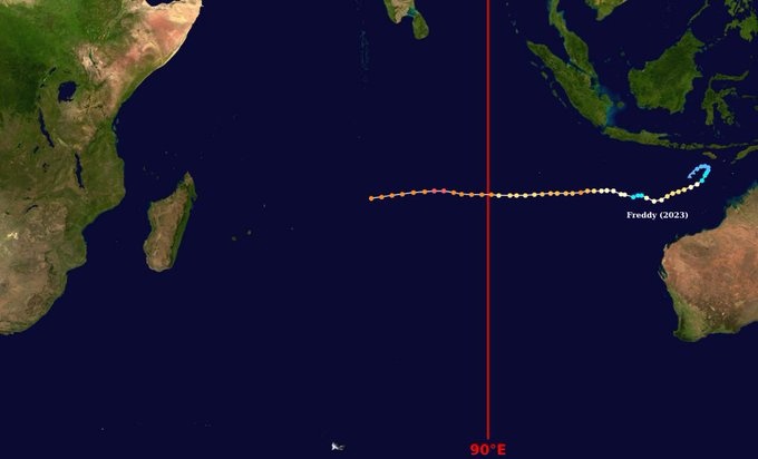 Jusqu’à présent, le cyclone Freddy a parcouru plus de la moitié du diamètre de l’océan Indien (~ 2 500 milles). Le record est de 6 800 milles parcourus par le cyclone Leon-Eline en 2000, qui a duré 4 semaines. Freddy pourrait franchir la barre des 5 000 milles à l’approche de l’Afrique la semaine prochaine.