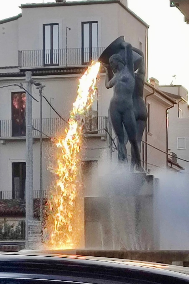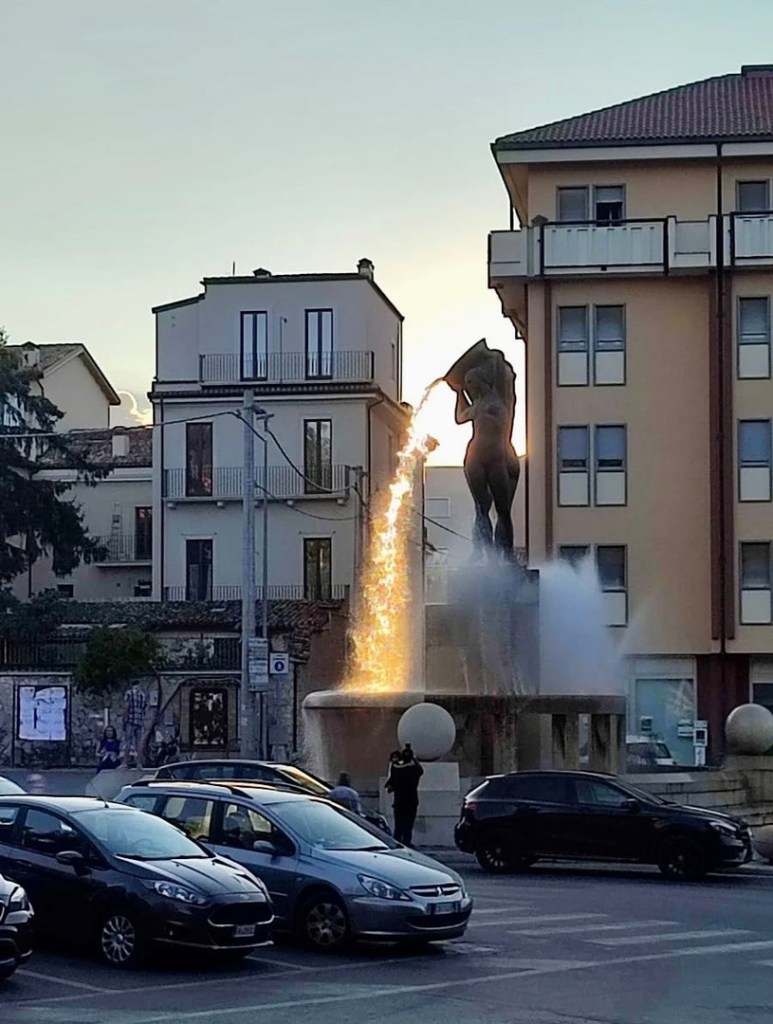 Dans la ville de L’Aquila en Italie, il y a une fontaine qui s’appelle Fontana Luminosa « fontaine lumineuse ». Lorsque le soleil frappe juste au bon angle, l’eau ressemble à de l’eau de feu