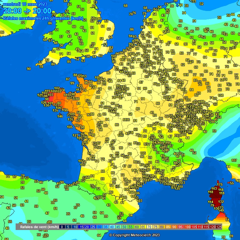 Quelques valeurs de rafales de vent mesurés le 10 Mars 2023
