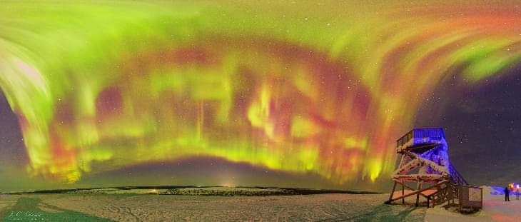 En quelques minutes, le spectacle des aurores s’agrandit, avec une multitude de formes, entremêlant couleurs vertes et rouges et mouvements flashy. Les aurores ont atteint le sommet du ciel couvrant tout l’horizon nord dans toutes sortes de formes et de tailles, un spectacle qui a duré plusieurs minutes. »