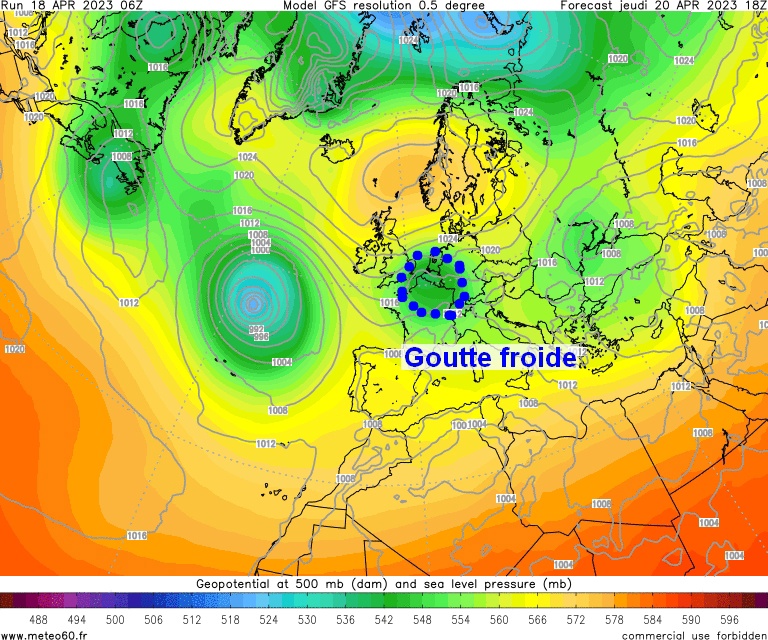 Les gouttes froides font leur réapparition , elles sont autonomes , en sortant de la circulation atmosphérique et elles se mettent à jouer avec les anticyclones , elles avancent , reculent , montent , descendent et les masses d’air froid et sec se rencontrent à différents degrés , elles peuvent tout engendrer , tornade , orage supercellulaire , pluies diluviennes , rafales de vents descendantes , activité électrique intense , grêle , variations thermique , gel noire etc..