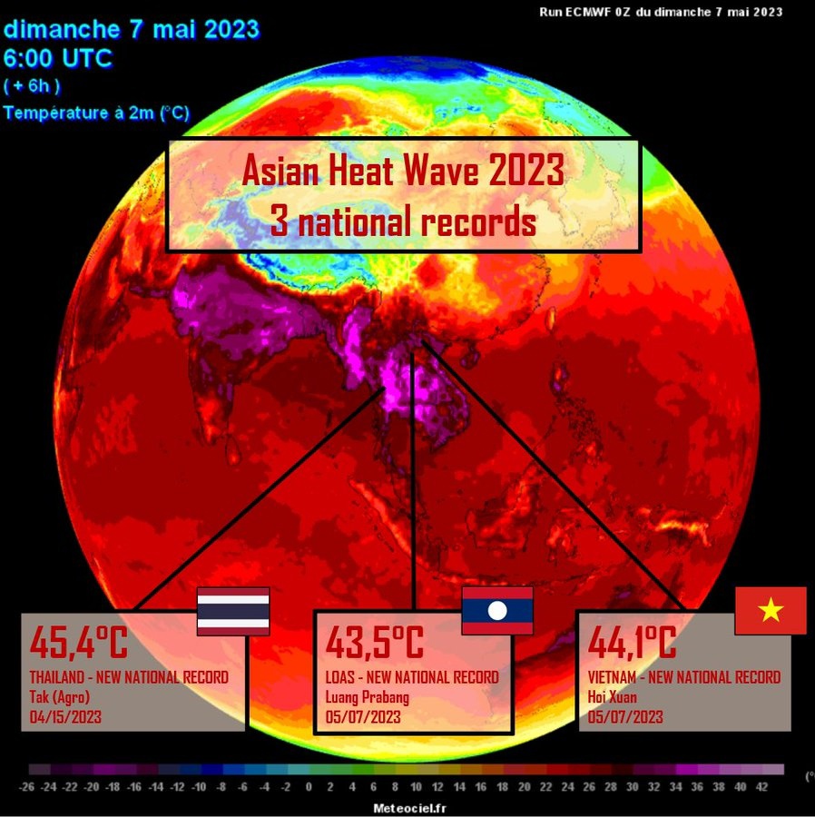 des centaines de records dont 3 nationaux : 45.4°C (Thaïlande), 44.1°C (Vietnam) & 43.5°C (Laos).