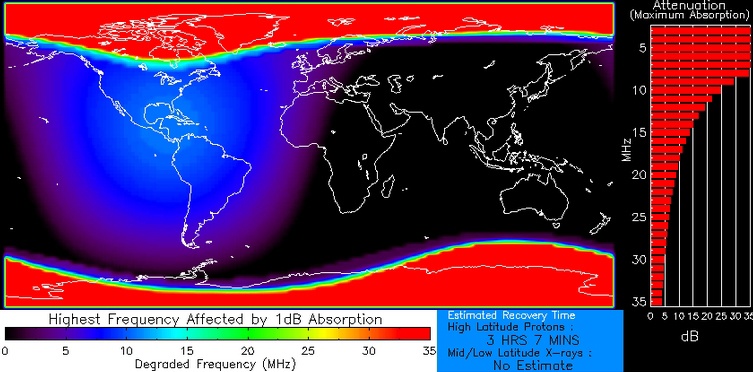 Des protons accélérés par le halo CME du 7 mai frappent maintenant notre planète. Le champ magnétique terrestre canalise ces particules vers les pôles où leur effet ionisant provoque l’absorption de la radio à ondes courtes.