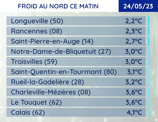 Réveil très frais ce 24 mai pour le nord de la France. On relève seulement 2,2°C à Longueville dans la Manche et 2,3°C à Rancennes dans les Ardennes.