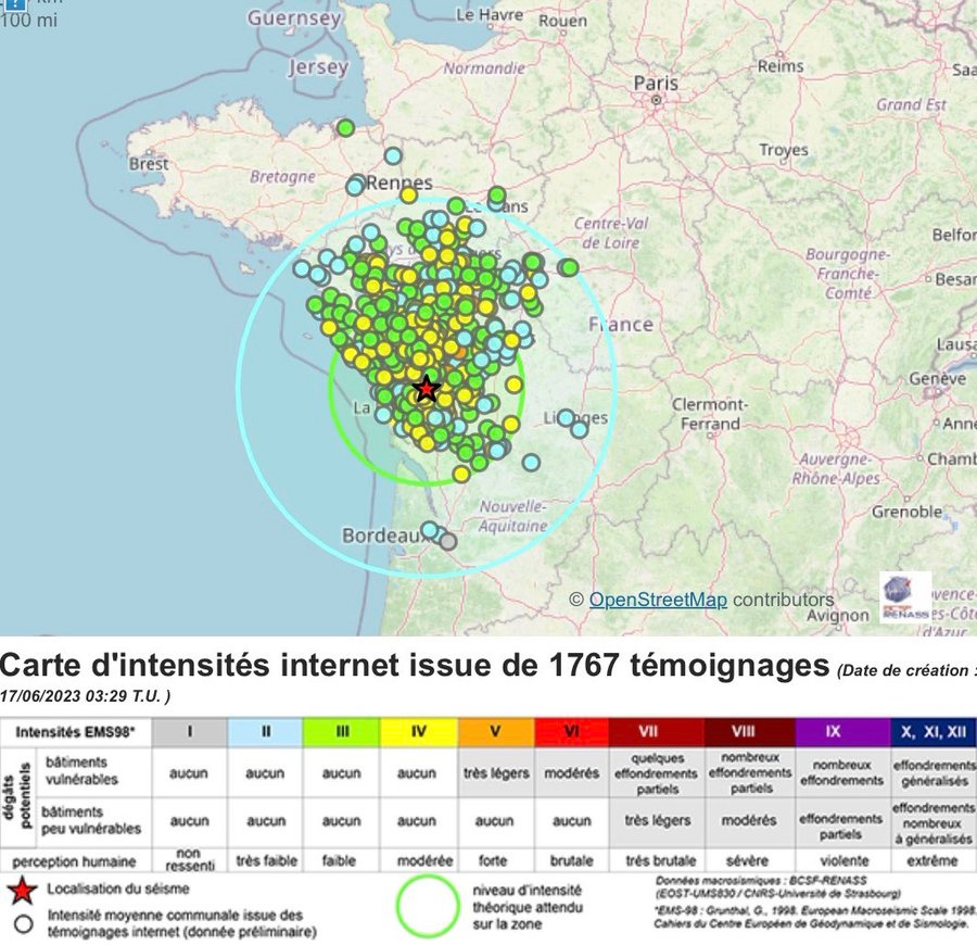 En début de soirée, du 16.6/2023 , à 18h38 , un tremblement de terre s’est produit du côté de Niort en France. Celui-ci est d’une magnitude plutôt rare sur le pays avec des estimations allant de 5,2 à 5.9 sur l’échelle de Richter. Certaines structures ont été impactées par ce séisme. Aussi, le séisme a été ressenti sur l’ensemble de la région Pays de la Loire ainsi que sur les départements voisins.