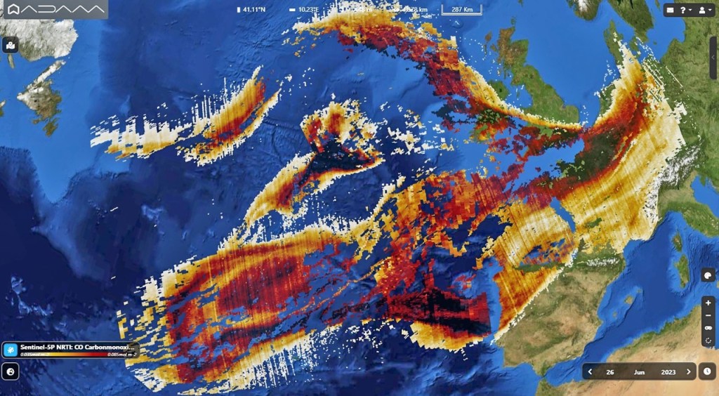 le 24 juin un immense panache de fumée des feux de forêt du Canada traversé vers l’Europe , pendant qu’en même temps une énorme tempête de poussière saharienne d ‘Afrique traversée dans l’autre sens..