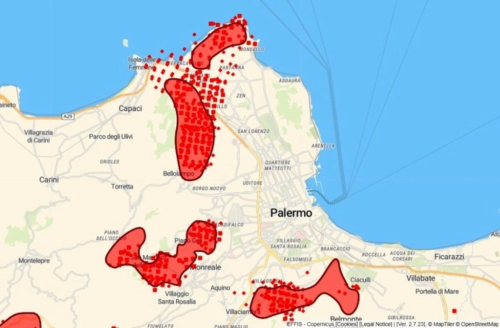 🚨🚨🔥 L’Italie subit aussi des incendies dramatiques. C’est notamment le cas en Sicile. Ici, les flammes atteignent la ville de Palerme, peuplée de plus de 650.000 personnes !