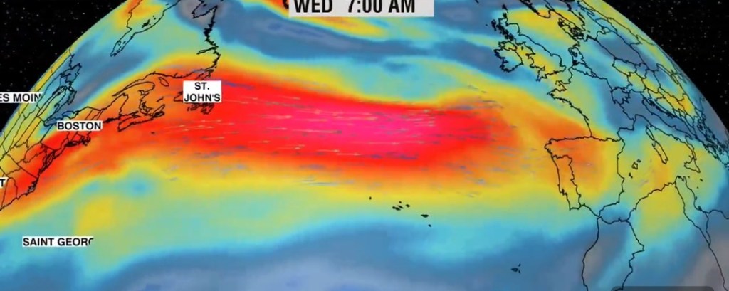 950 Mo serait une dépression presque record pour la région (équivalent d’un ouragan de catégorie 3 ). La tempête est propulsée par un jet stream de 320km/h en altitude ! c’est LUI qui apporte l’énergie…