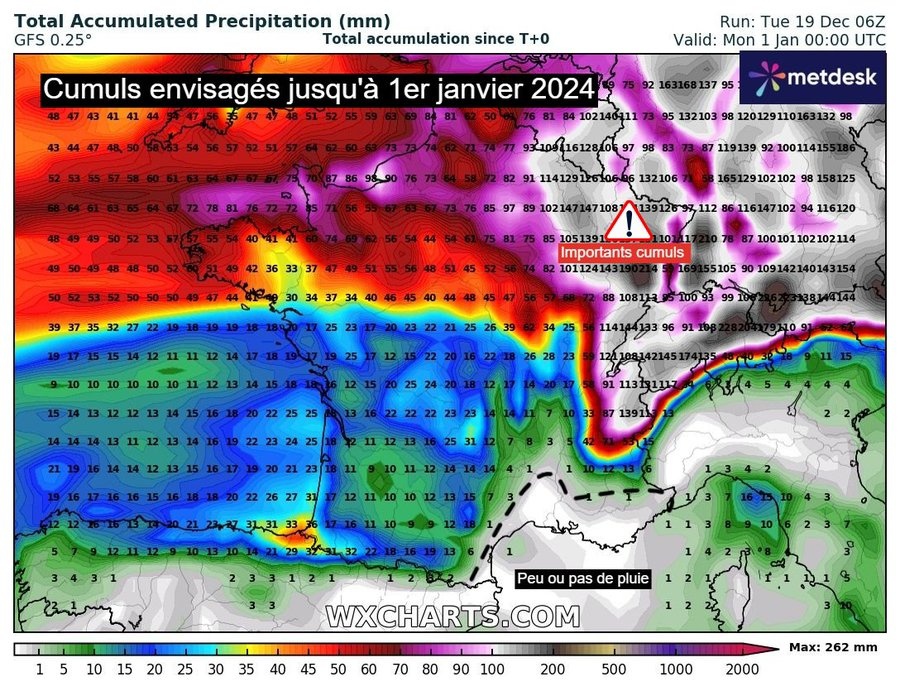 Des cumuls importants sont envisagés sur le Nord-Est d’ici la fin de l’année, aucune pluie significative ne devrait concerner la Méditerranée.