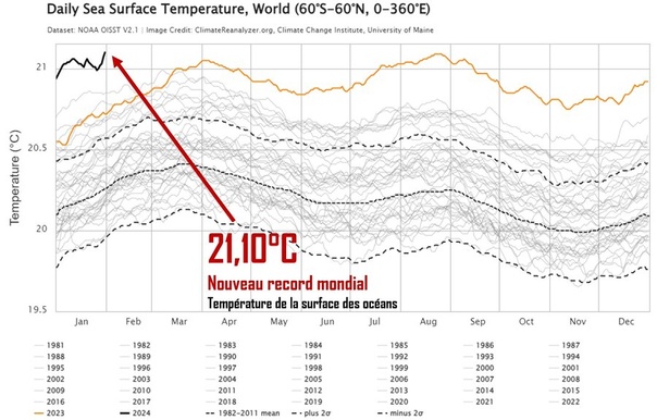 Les océans de la Terre ont établi le 1.2/2024 un nouveau record de température de surface à 21,10°C. Le précédent record avait été établi il y a seulement quelques mois, en août 2023.