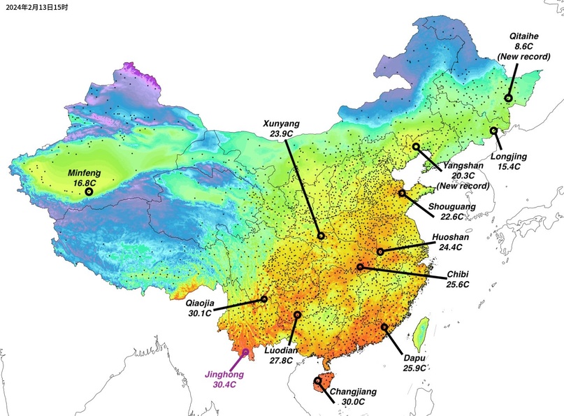 Les températures dans le NORD de la Chine ont fortement augmenté aujourd’hui, avec 68 stations battant des records de mi-février et Heilongjiang Qitaihe battant des records mensuels.