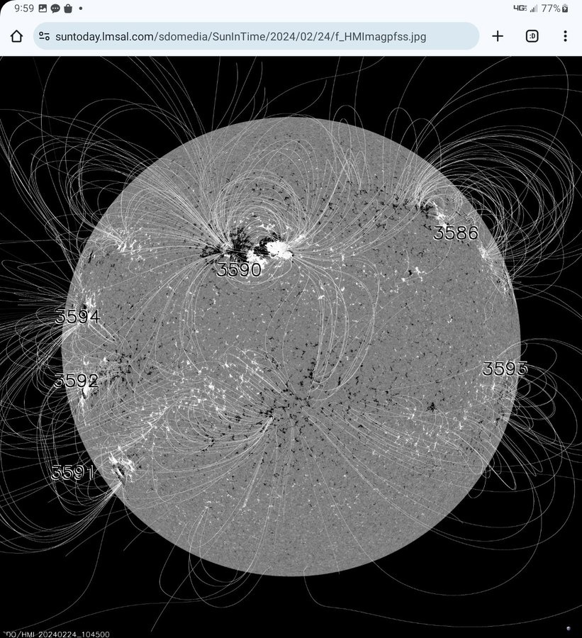 Le Soleil le 24.2/2024 à 10h45 Avec modèle de ligne de champ magnétique.l’AR13590 a déclenché 3 éruptions X Partager : Cliquez pour partager sur Telegram(ouvre dans une nouvelle fenêtre) Telegram Cliquez pour partager sur WhatsApp(ouvre dans une nouvelle fenêtre) WhatsApp Cliquer pour envoyer un lien par e-mail à un ami(ouvre dans une nouvelle fenêtre) E-mail Cliquez pour partager sur Facebook(ouvre dans une nouvelle fenêtre) Facebook Cliquer pour partager sur X(ouvre dans une nouvelle fenêtre) X Similaire Les commentaires sont fermés.