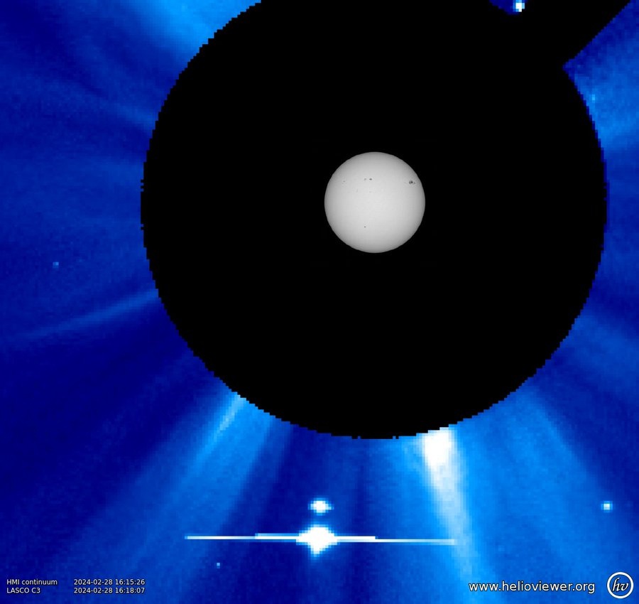 Les planètes Mercure et Saturne entrent en conjonction juste en dessous du Soleil. Cette conjonction n’a pu être vue que par les coronographes SOHO LASCO car ils étaient proches du Soleil. Mercure est la plus brillante des deux, Saturne au-dessus mais beaucoup plus faible (étant beaucoup plus éloignée).