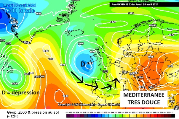 Comme on peut le voir sur la carte…la dépression, masse d’air froid se trouve entre 2 anticyclones masse d’air chaud..