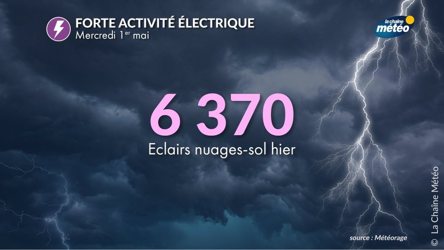 Avec 6370 éclairs nuages-sol observés ce mercredi 1ᵉʳ mai entre le centre-est, la Normandie et le bassin parisien principalement, c’est la 2ᵉ journée la plus orageuse depuis septembre 2023, et derrière le 8 avril 2024.