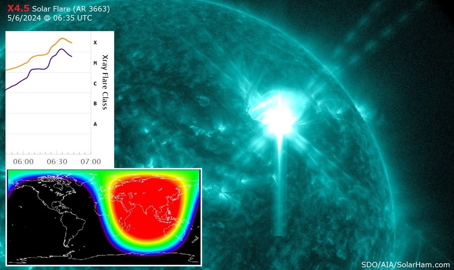 6.5/2024 X4.52 Une éruption solaire majeure approchant le niveau X5 (R3 Radio Blackout) autour de AR 3663. Partager : Partager sur Telegram(ouvre dans une nouvelle fenêtre) Telegram Partager sur WhatsApp(ouvre dans une nouvelle fenêtre) WhatsApp Envoyer un lien par e-mail à un ami(ouvre dans une nouvelle fenêtre) E-mail Partager sur Facebook(ouvre dans une nouvelle fenêtre) Facebook Partager sur X(ouvre dans une nouvelle fenêtre) X Similaire Les commentaires sont fermés.