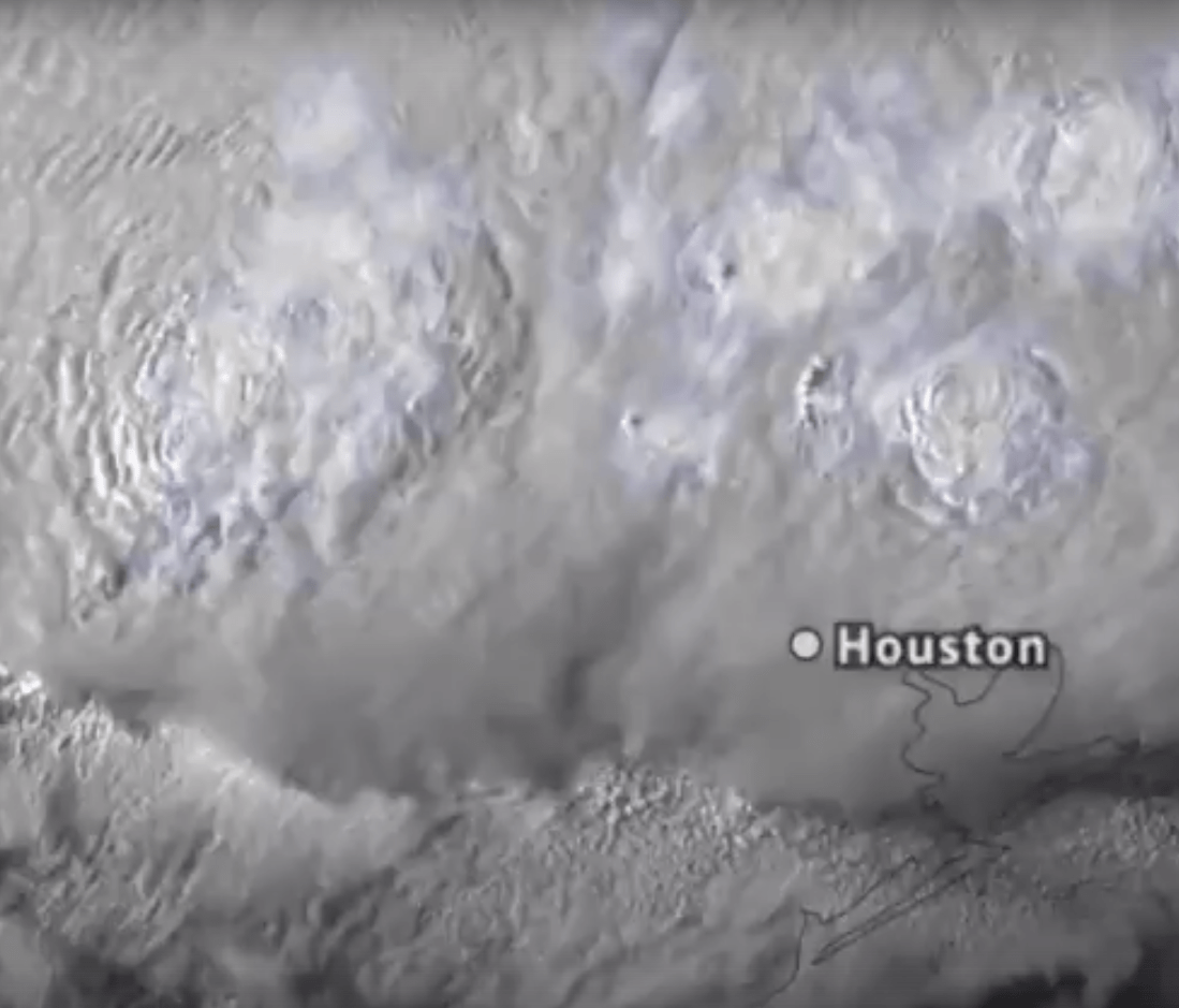 Cette vue montre l’activité électrique de folie, les orages remplis d’éclairs qui mitraille Houston.