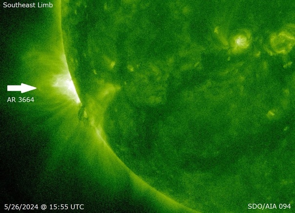 AR 3664, à l’origine de 12 éruptions solaires de classe X entre le 8 et le 15 mai et de multiples éjections de masse coronale dirigées vers la Terre qui ont conduit à une tempête géomagnétique extrême historique les 10 et 11 mai, est de retour…