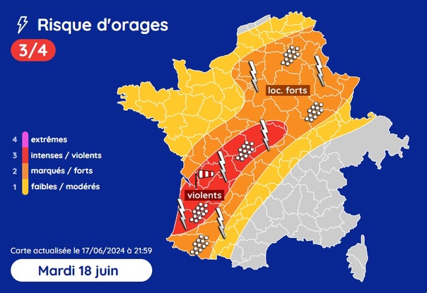 Le système convectif de mésoéchelle qui est remonté cette nuit du nord de l’Aquitaine au Centre a produit des orages violents entre nord Gironde et Charente-Maritime (grêlons > 5 cm) et forts sur le reste de l’axe. Les rafales ont localement atteint 100 km/h sous orage.