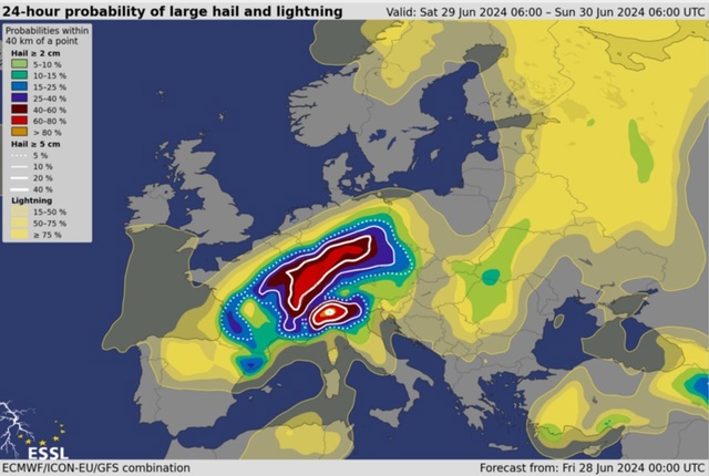 Les simulations laissent entrevoir des rafales de vent de 130-140 km/h ainsi que des grêlons de 7 à 9 cm sous les orages les + forts demain.
