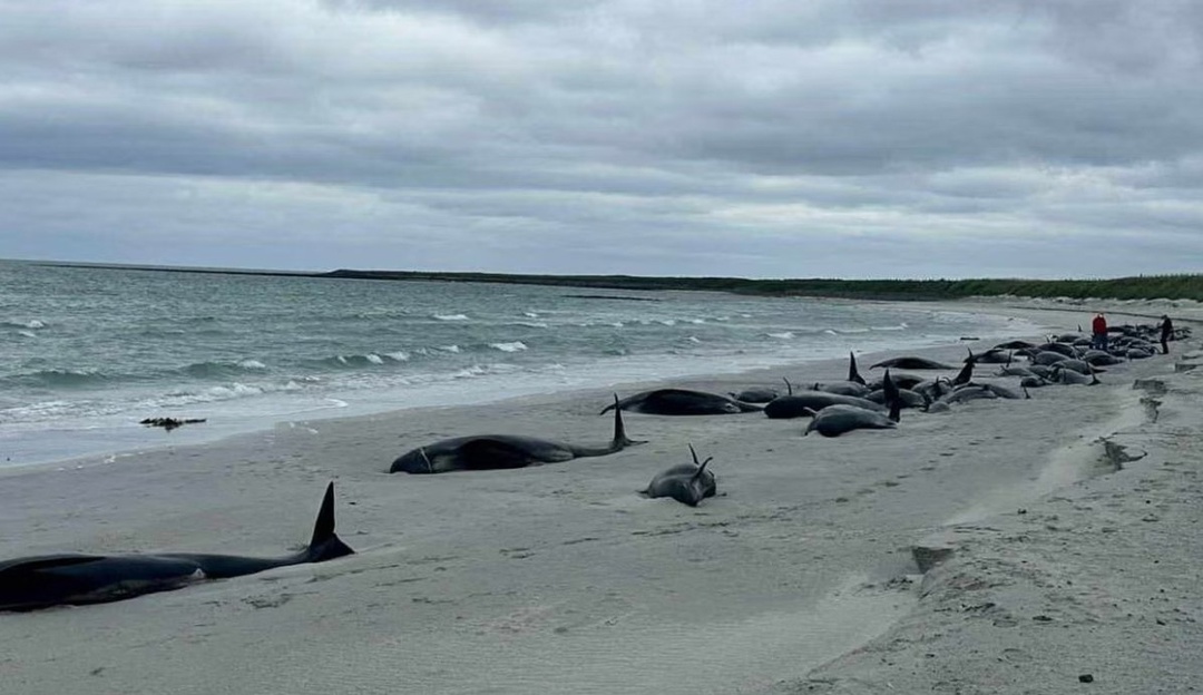 Un groupe de 77 dauphins noirs s’est échoué sur la plage de Tresness, dans les îles Orcades, au large de la côte nord-est de l’Écosse.