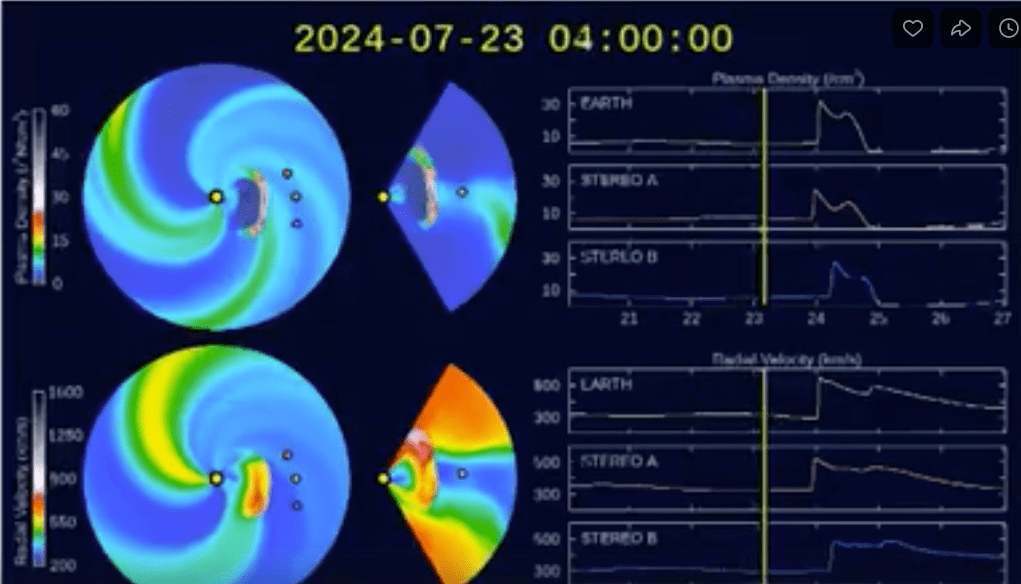Deux CME sont attendues, la première celle du 19 juillet, arrivera aujourd’hui 23 juillet, et la seconde, celle du 21 juillet, arrivera plus probablement tôt le 24 juillet. (voir en même temps que la première)