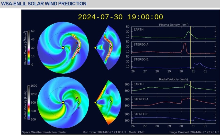 L’activité solaire a considérablement augmenté au cours des dernières 24 heures (de 11 UTC hier à 11 UTC aujourd’hui). Nous avons observé sept éruptions de type M, dont trois supérieures à M5, et une éruption presque X, une M9,9. Les éruptions de type M des dernières 24 heures sont toutes associées à de multiples CME. Ce déluge d’éruptions solaires est actuellement analysé.