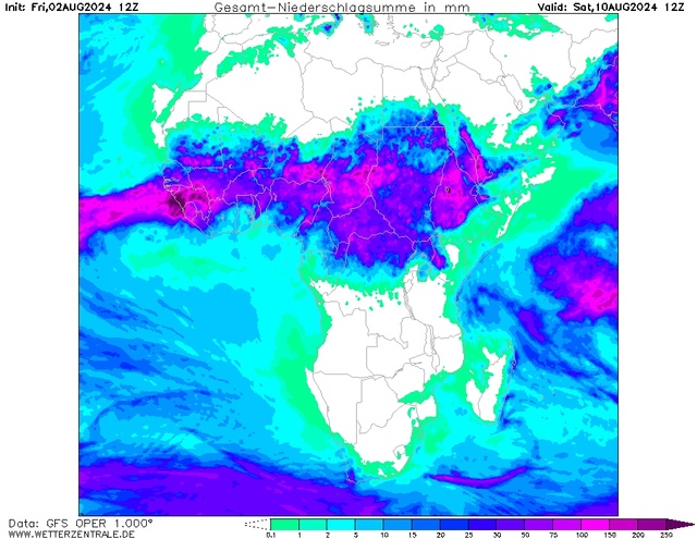 Ce qui est étonnant, c’est que dans les prochains jours, la circulation de mousson africaine va être très élevée, à tel point qu’il pleuvra dans des zones où il ne pleut jamais, comme le sud de l’Égypte. Là-bas, la pluviométrie annuelle moyenne est inférieure à 1 mm.