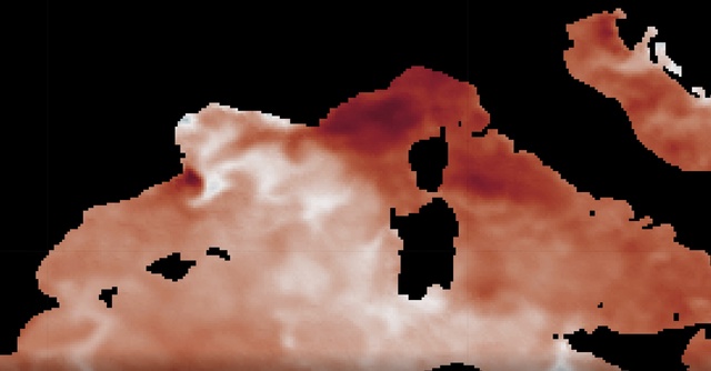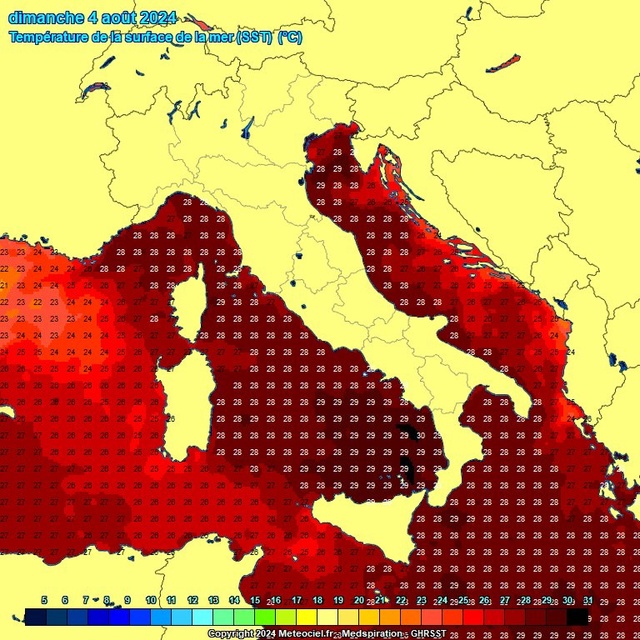 En Mer Ligure, Méditerranée, les températures atteignent 28-30°C, (anomalie de +4°C)..