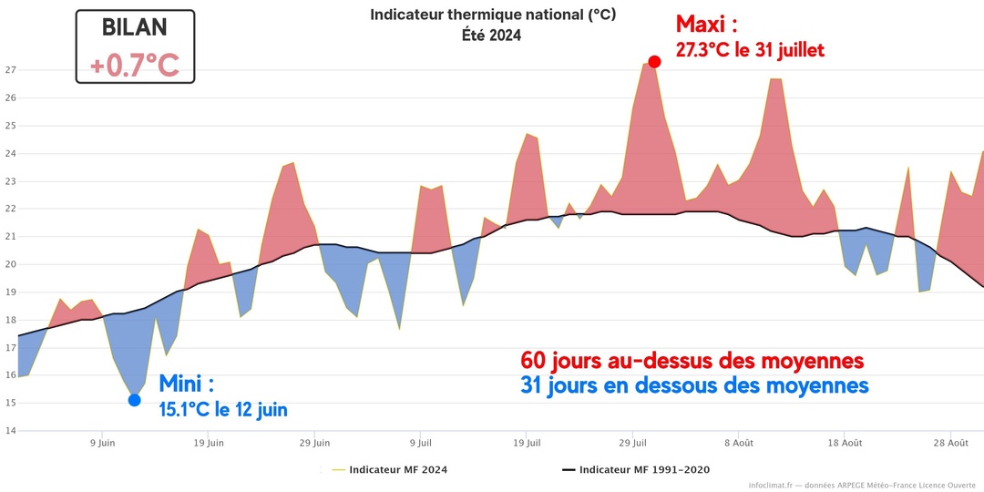 Malgré un ressenti faussé par de fréquents orages, l’été 2024 ne fut pas frais. Il termine avec un excédent de +0,7°C par rapport aux normales et arrive au 10ème rang des plus chauds depuis le début des mesures.