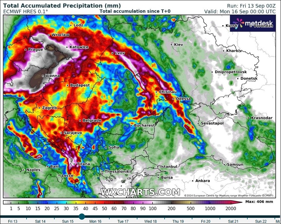 les cumuls de pluies sont déjà très conséquents en Slovénie. En Autriche des cumuls de neige de 30 cm ont été enregistrés dans le Tyrol. Au total, 7 pays d’Europe centrale sont concernés par cet événement au cours duquel on attend localement jusqu’à 400 mm d’ici dimanche.
