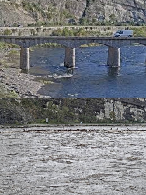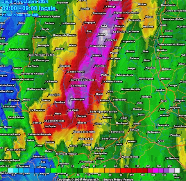 Lames d’eau sévères à extrêmes (R5) sur les Cévennes ardéchoises jusqu’à 508 mm à Mayres sur les hauteurs ardéchoises sur 24h, la station de la Croix-de-Bauzon affiche 631 mm/24h. 746 mm depuis le début de l’épisode !