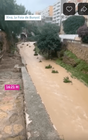 Au début, un petit cours d’eau tranquille et puis l’eau de la haut déversée en continu, a fait gonfler la Rambla de Poio.