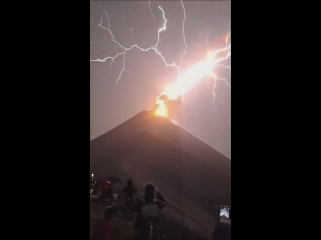 La foudre, le feu du ciel frappe le Volcan FUEGO, de feu en éruption..