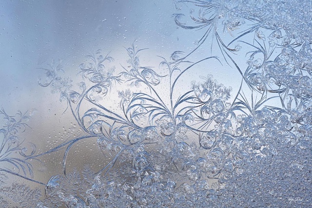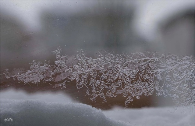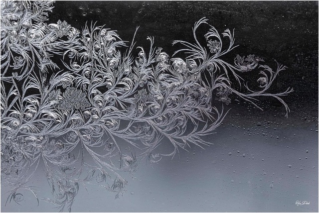 La vapeur d’eau se cristallise directement sur du verre froid, dans son processus de changement d’état, de changement vibratoire, il apparaît alors une création complexe et envoûtante –