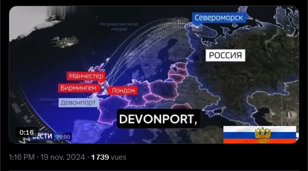 La TV d’État Russe a présenté une carte des pays d’Europe -dont la France- qui pourraient subir des frappes nucléaires russes si l’Ukraine envoie des missiles sur la Russie.
