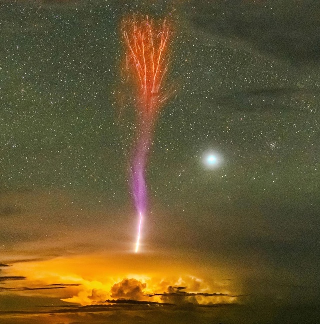 Le changement de couleur et de structure du jet en fonction de l’altitude correspond à différentes valeurs d’énergie des particules impliquées dans la décharge électrique.