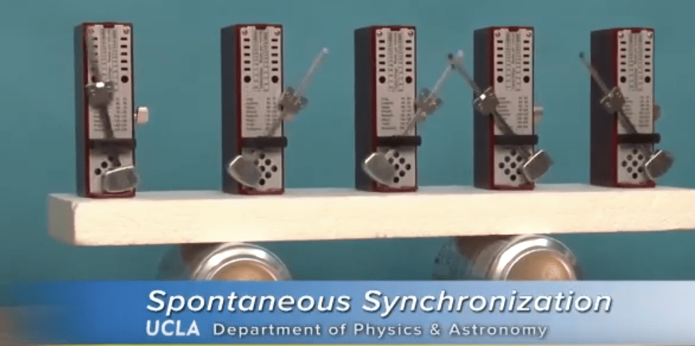 Des métronomes, d’abord désynchronisés, s’alignent progressivement après une courte période grâce au mouvement latéral de leur base commune, qui leur permet de s’influencer mutuellement.