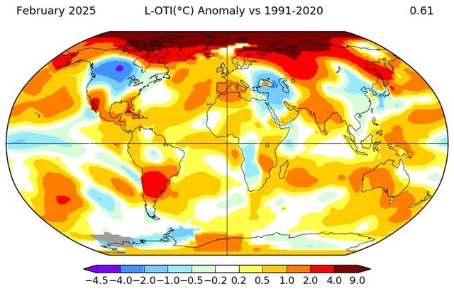 La température a dépassé la moyenne presque partout dans l’ Arctique , avec une anomalie maximale de +10,6 °C en février 2025 selon les données ERA5. L’anomalie journalière a même atteint +20 °C dans certaines zones, ce qui a entraîné une banquise à son plus bas niveau en février……..