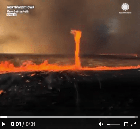🚨🔥 Une vidéo prise par un drone a capturé une tornade de feu lors d’un brûlage agricole dirigé dans le nord-ouest de l’Iowa la semaine dernière.