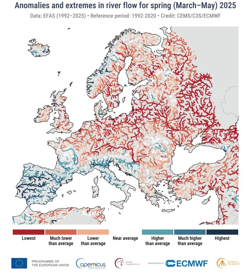 Le printemps 2025 a enregistré le débit fluvial saisonnier le plus faible en Europe depuis le début des relevés EFAS en 1992. Cette nouvelle carte, publiée dans le Bulletin climatique C3S de mai, met en évidence des débits généralement inférieurs à la moyenne en Europe centrale, orientale et septentrionale.