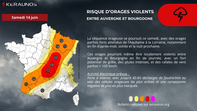 Les orages vont se multiplier et s’intensifier en fin de journée de l’Aquitaine jusqu’aux régions du nord-est. Ils seront parfois violents entre Auvergne et Bourgogne en fin d’après-midi et soirée, avec un fort risque de grêle.