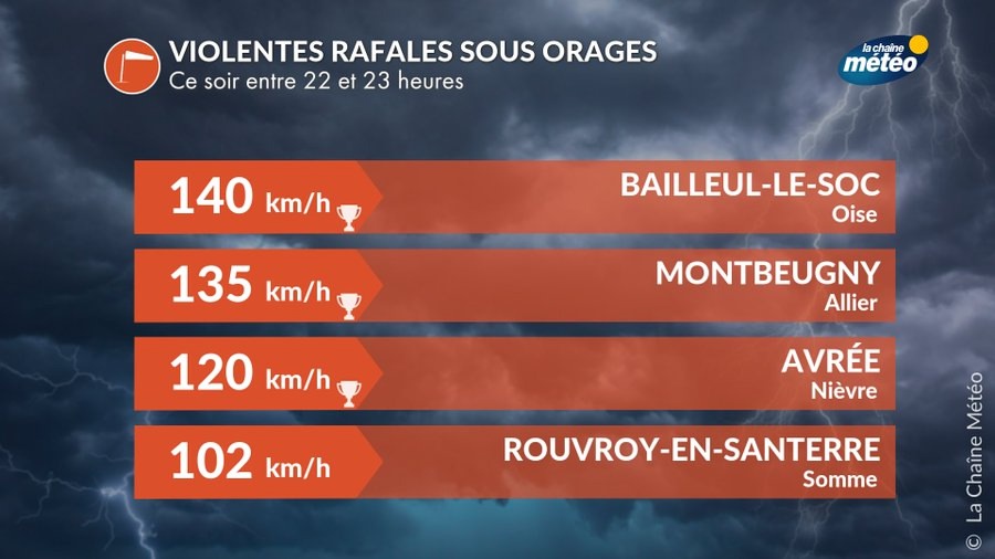 Parmi les phénomènes violents associés aux orages, des rafales de vent pouvant aller jusqu’à 114 km/h à Montauban, dans le Tarn-et-Garonne, ont été mesurées. Dans l’Eure, au niveau de la commune de Bernay, celles-ci sont même montées jusqu’à 126km/h. Dans les Pays de la Loire, de nombreuses localités ont été balayées par de la grêle comme Saint-Hilaire-de-Loulay (Vendée) ou Charenton-du-Cher (Cher) mais également dans les Landes où des grêlons de six centimètres de diamètre ont été ramassés par des riverains.