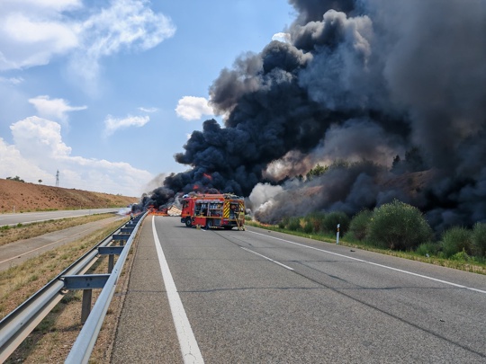 un incendie phénoménal et rampant sur l’A-23 (autoroute mudéjar) s’est produit près de Cariñena, Saragosse en Espagne.
