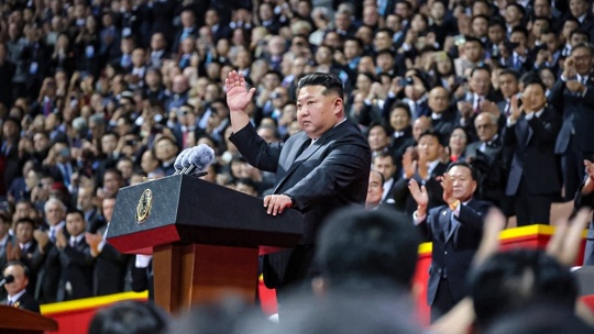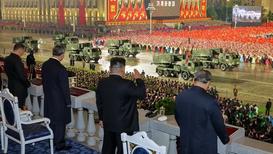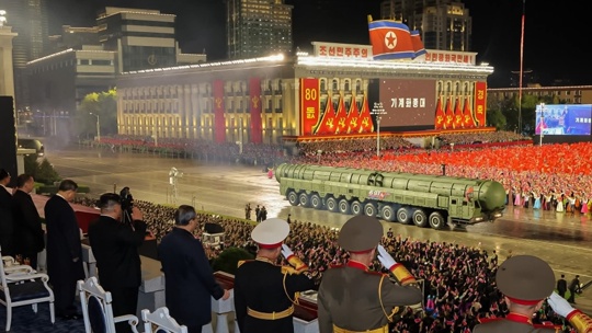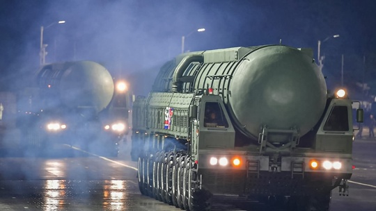 đ Le nouveau missile Hwasong-20, capable de porter plusieurs ogives, a Ă©tĂ© montrĂ© lors d’un dĂ©filĂ©..