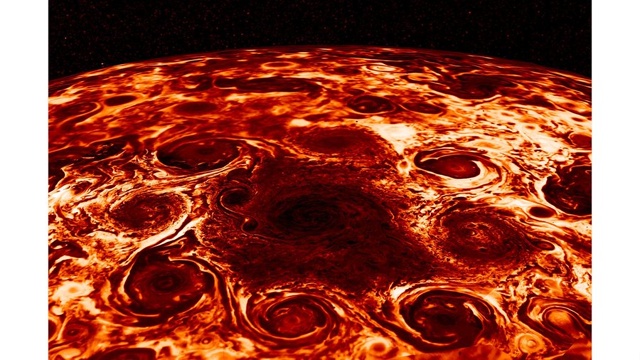 Voici une image des tourbillons des cyclones polaires de Jupiter.